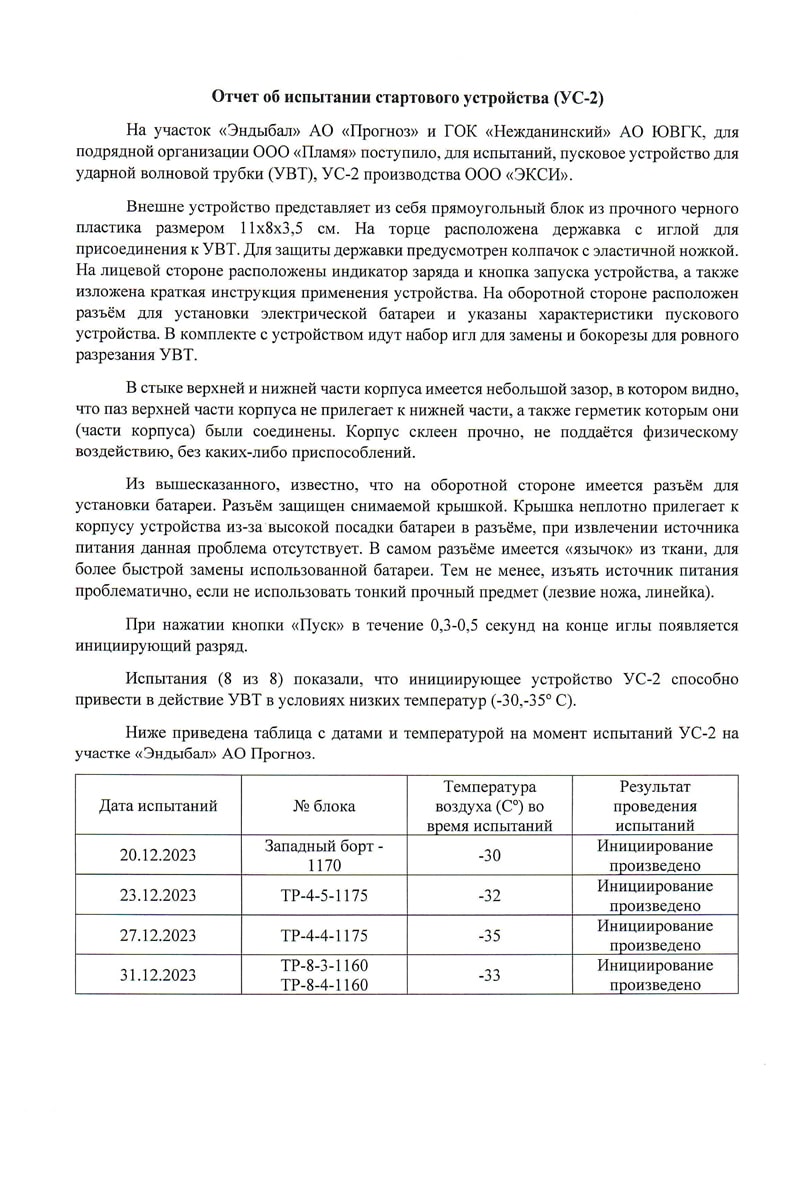 Подавляющее число систем инициирования используют первоначальный электрический импульс, обеспечивающий стартовые условия для подрыва группы зарядов или сети на блоке. При этом, рынок предлагает достаточный спектр существующих устройств, необходимость более широкого выбора надежных и проверенных средств, по-прежнему актуальна. Инженерно-конструкторский персонал занимается разработкой и изготовлением стартовых устройств для инициирования сети при взрывных работах. Учитывая особенности ведения таких работ в самых разных климатических условиях, нами создаются устройства без зависимости от внешних источников питания.