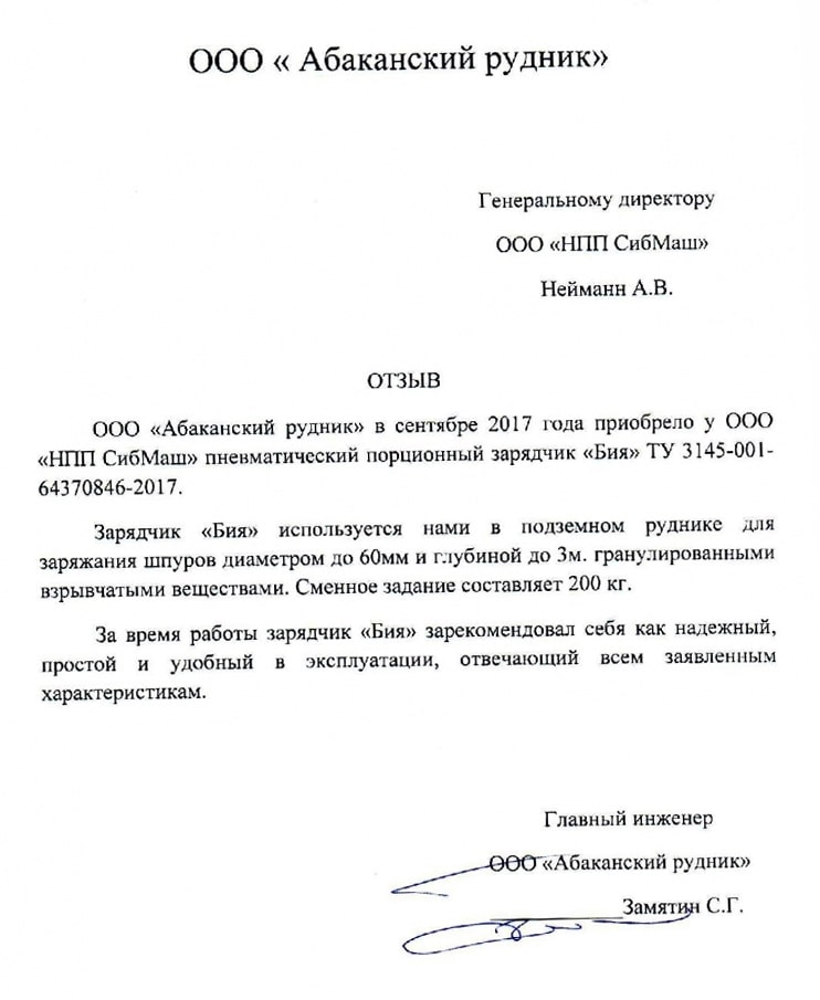 Получен положительный отзыв от ООО «Абаканский рудник» на ППЗ «Бия»
